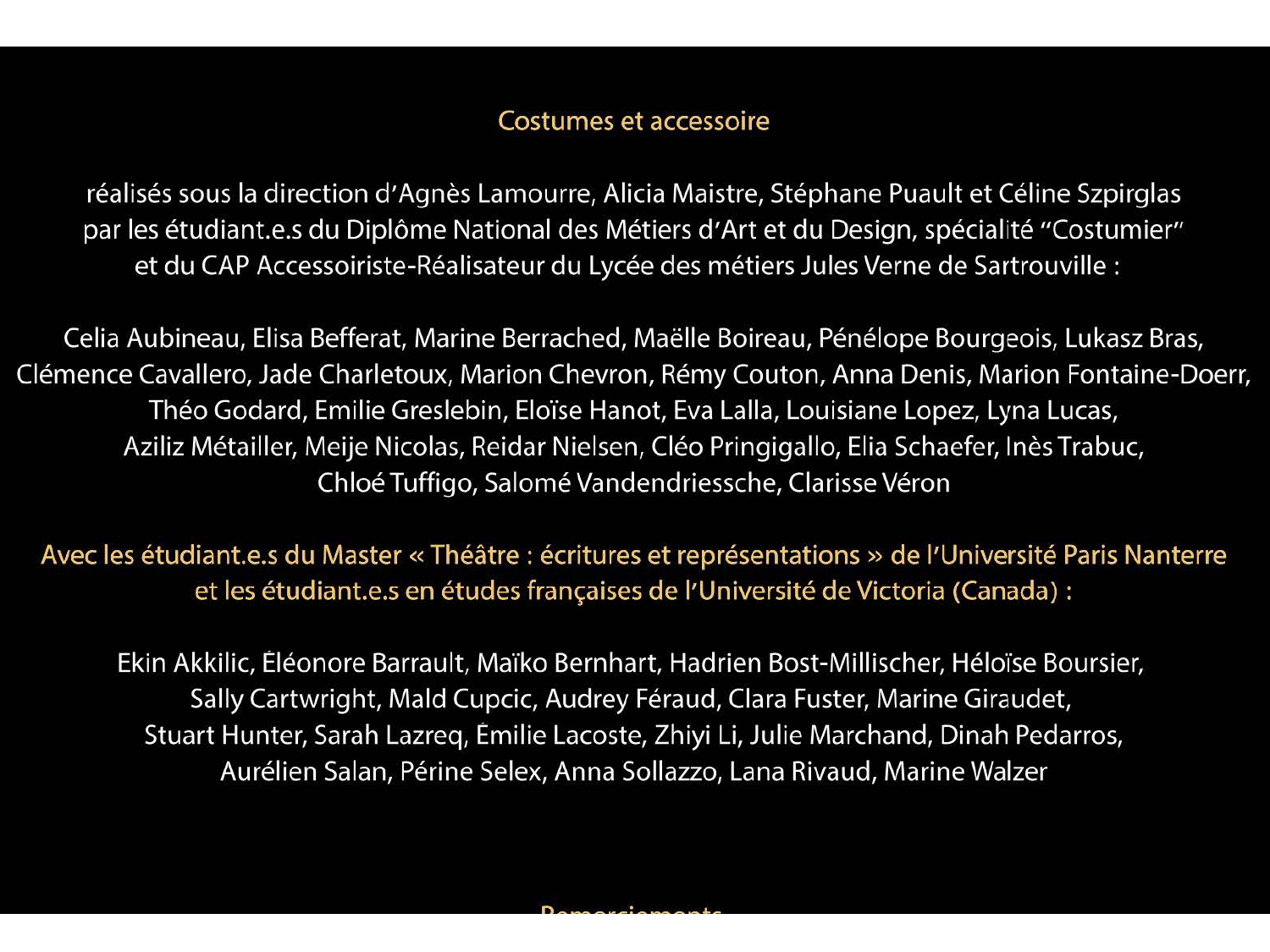 Des costumes pour le Master théâtre de l’UFR de Nanterre ; de nouveaux costumes peints ; une résidence d’une semaine aux Bouffes du Nord, pour Help, de la Cie Plein jour, un projet mené en arts appliqués mais avec un super coup de main de Stéphane Puault en atelier !